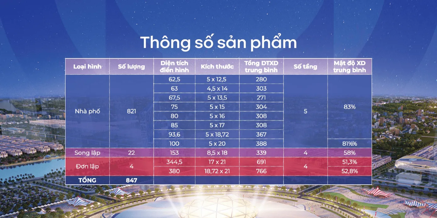 - Các loại hình sản phẩm: Nhà phố, Song lập, Đơn lập.