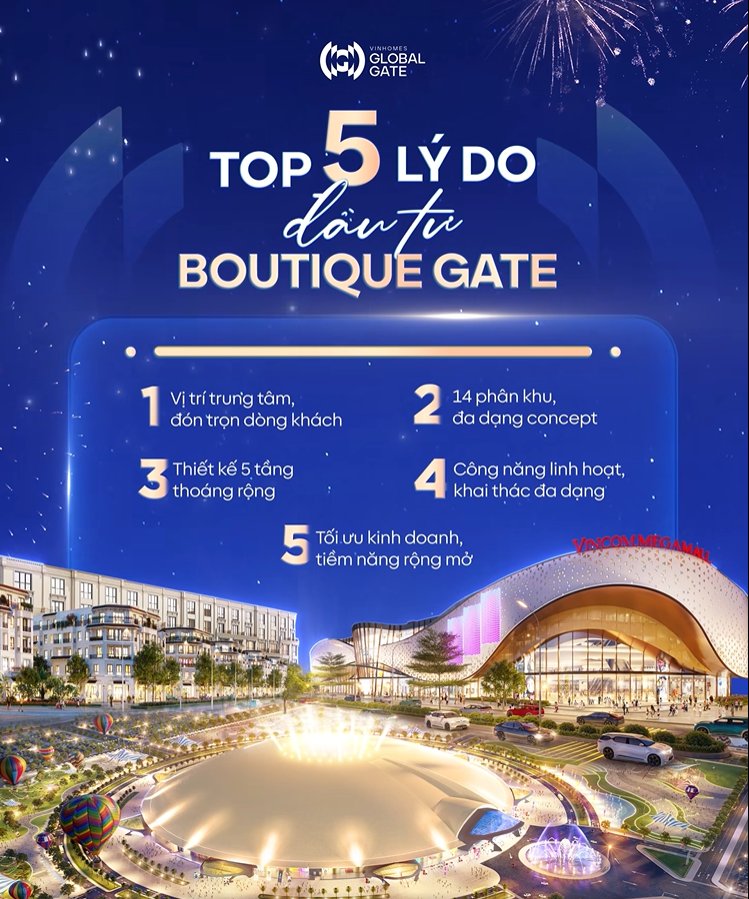 Số lượng sản phẩm Boutique Gate là giới hạn. Cơ hội chỉ dành cho những nhà đầu tư quyết đoán, có tầm nhìn xa và mong muốn khẳng định vị thế tại trái tim giao thương triệu đô, khởi đầu một kỷ nguyên thương mại tỷ đô rực rỡ. Đừng bỏ lỡ cơ hội lịch sử để sở hữu một tài sản đầu tư “vàng mười” – chỉ dành cho thế hệ nhà đầu tư tinh họa bậc nhất tại Việt Nam. Hãy liên hệ ngay với Vinhomes Global Gate để nhận những thông tin tư vấn chuyên sâu và độc quyền về siêu phẩm dịch vụ thương mại Boutique Gate tại Vinhomes Global Gate.